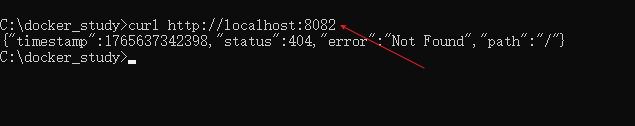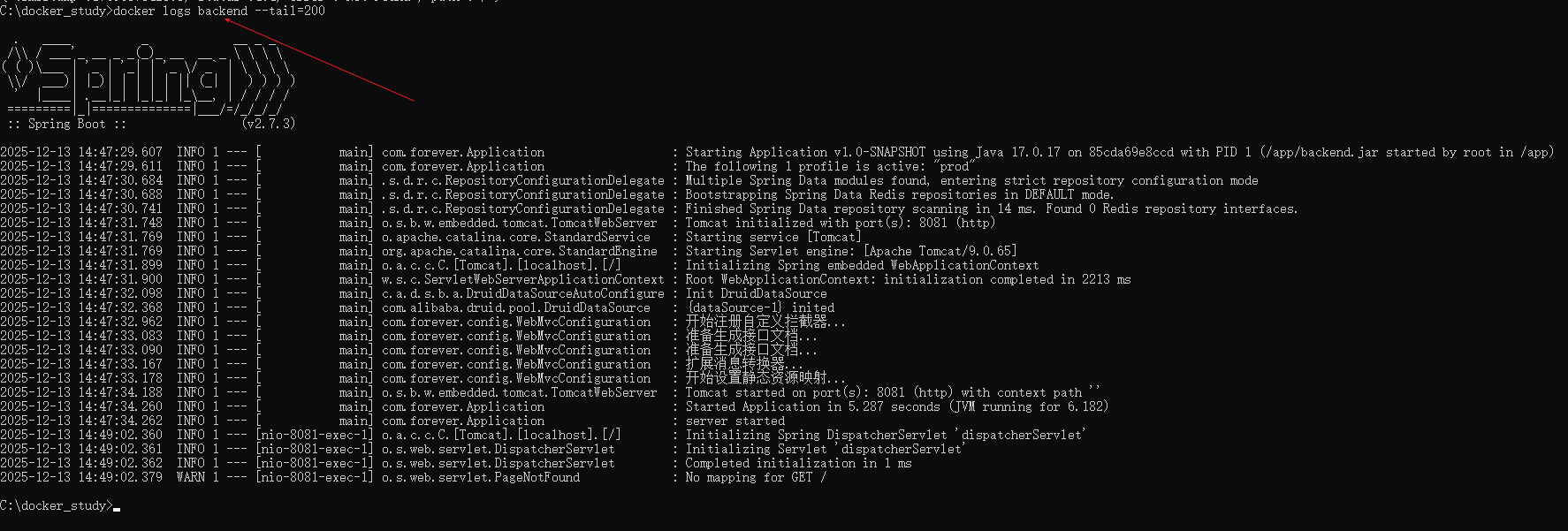 说明:后端容器已经启动并监听端口;Spring Boot 服务运行正常,但请求的路径 / 不存在。