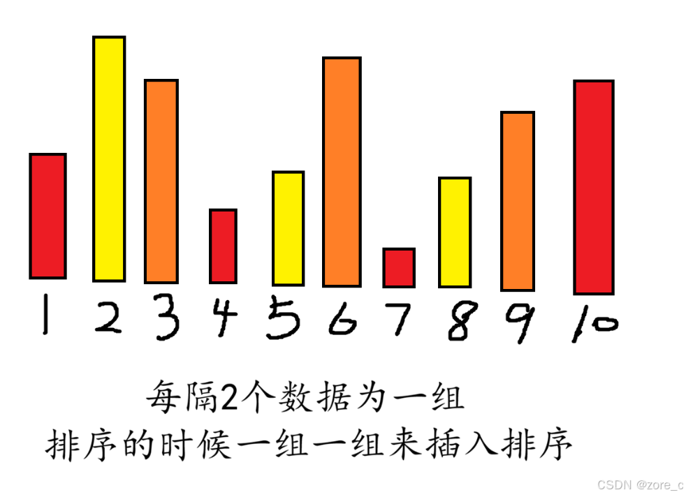 这里先假设分成3组数据进行排序,也就是每隔2个数据成一组