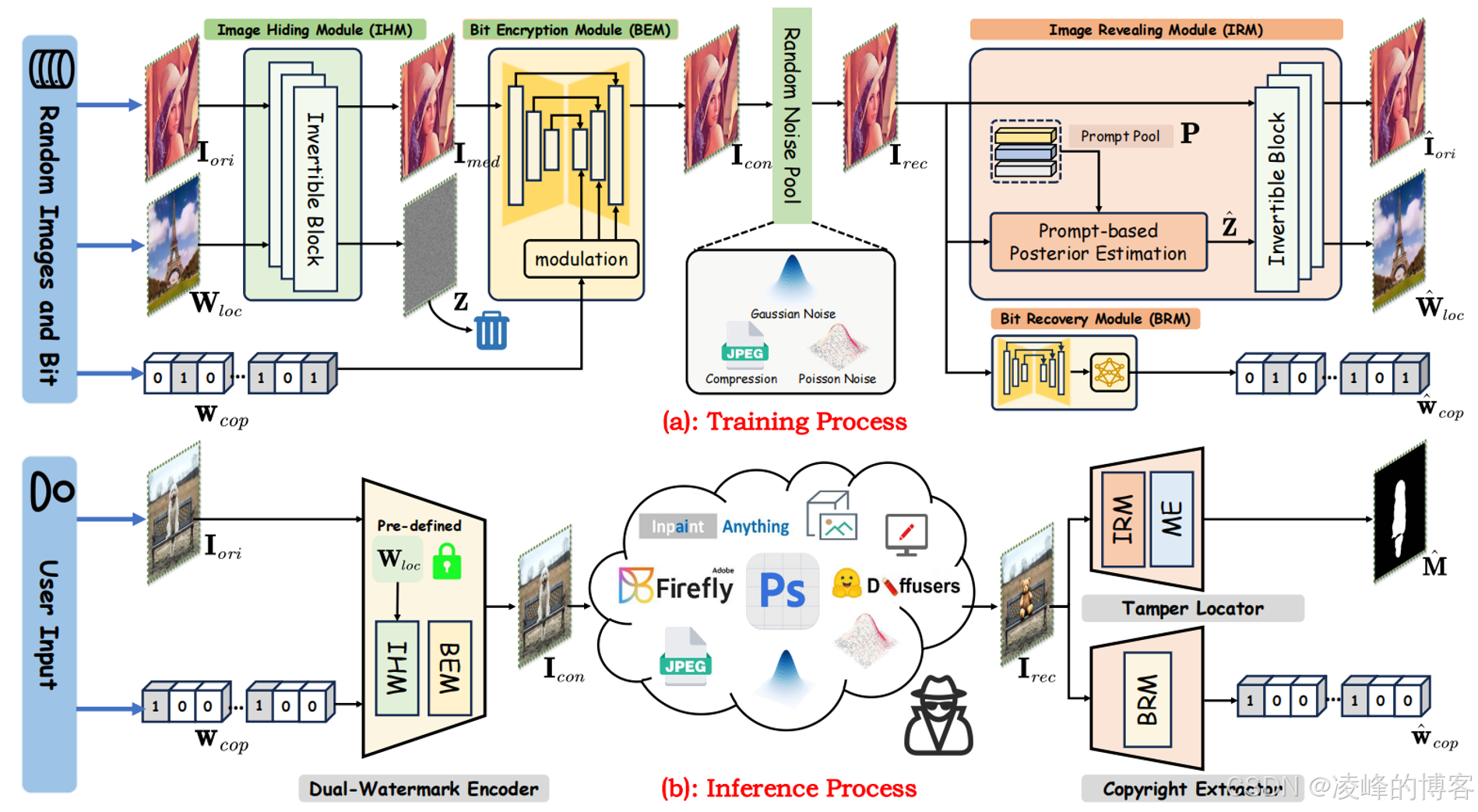 (a)训练流程:包含可逆图像隐写与鲁棒性水印两部分; 训练目标:能够实现隐写与完整恢复;鲁邦认证水印; (b)推理过程:采用任意图像作为秘密图像隐写至目标图像,经篡改后再恢复出秘密图像,通过像素比较得到篡改区域定位图。