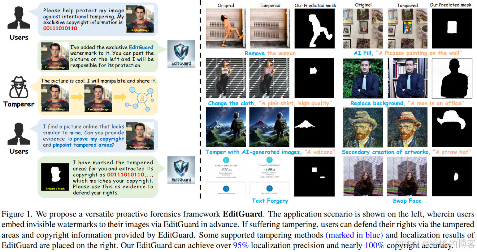 针对更加广泛的AIGC篡改编辑(换颜色、文字修改、换脸、二次创作等); 训练与篡改类型解耦:无需各类篡改数据来训练; 版权追溯(鲁邦)与篡改定位(脆弱)。