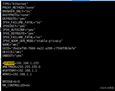 vim /etc/sysconfig/network-scripts/ifcfg-em1 #我的物理网卡是ifcfg-em1