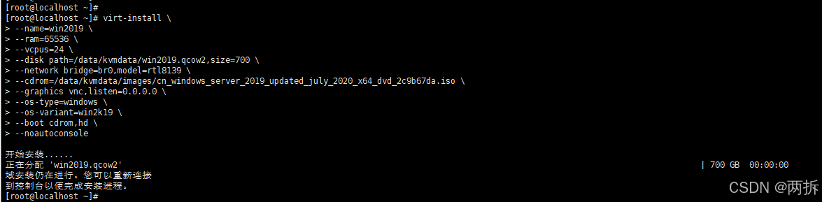 --disk path=/data/kvmdata/win2019.qcow2,size=700 \ #磁盘文件路径和名称,qcow2格式,大小为700G