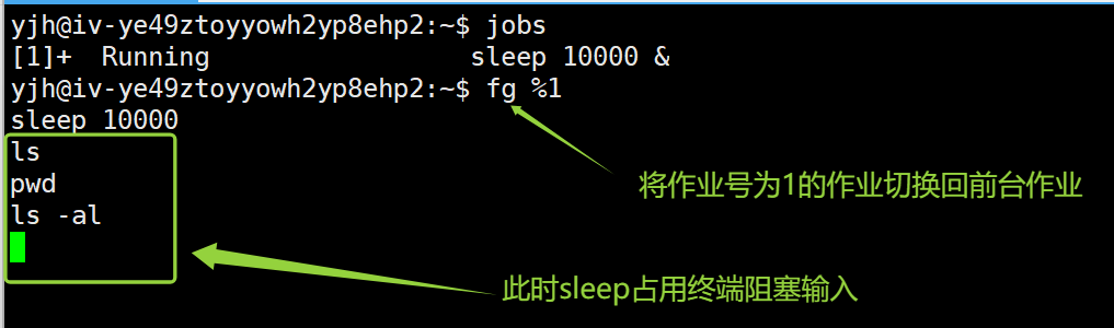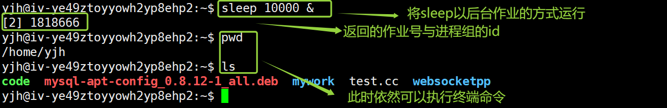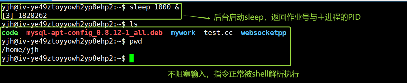 后台作业启动后,终端的标准输入(stdin)控制权会立刻交还给 Shell,用户无需等待作业结束,就能继续执行其他命令。比如我们执行sleep 1000 &(&是后台作业的标志)指令后,我们依然还可以输入ls,ls -al,pwd等指令并执行: