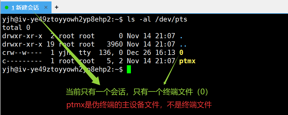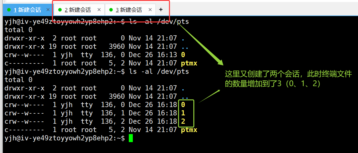 每个控制终端会对应唯一的终端文件 (比如图中的 "终端文件 1" 对应/dev/pts/0,"终端文件 2" 对应/dev/pts/1):