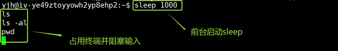 在一个终端中只能存在一个前台作业,它会占用终端并阻塞用户输入,核心原因是 **前台作业会独占终端的输入输出资源,且 Shell 会进入等待状态放弃终端控制权,**此时用户输入的指令无法被shell接受和解析。