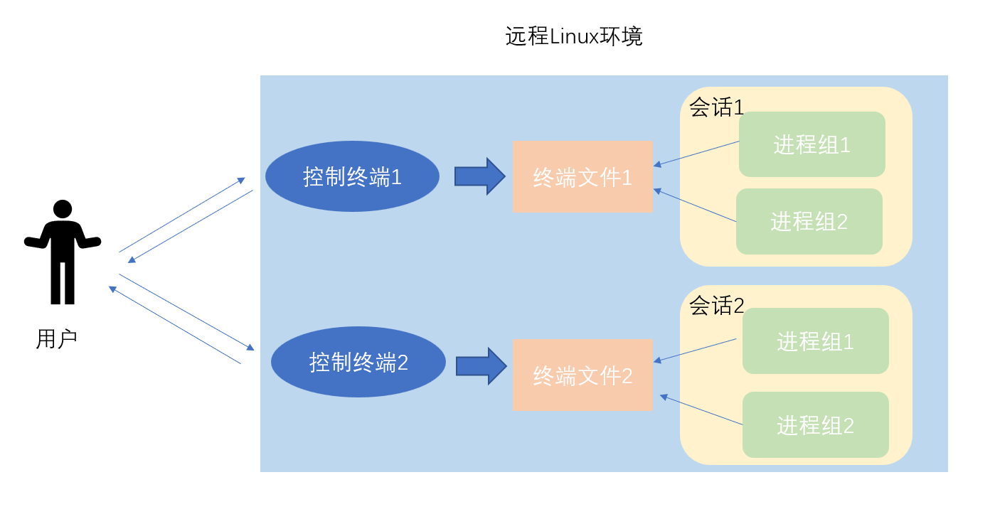 用户通过多个独立的控制终端(比如同时打开的两个 SSH 窗口)连接远程 Linux 环境 ------ 每个控制终端是用户与系统交互的 "入口"。