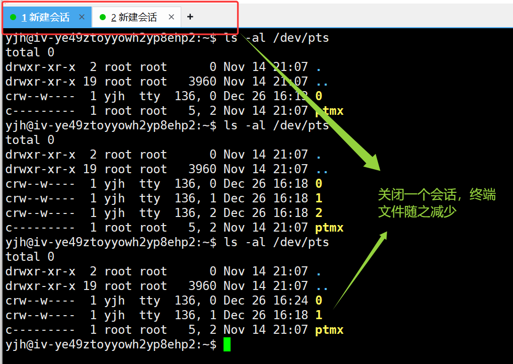 每个终端文件会绑定到一个独立的会话(图中的 "会话 1""会话 2"):