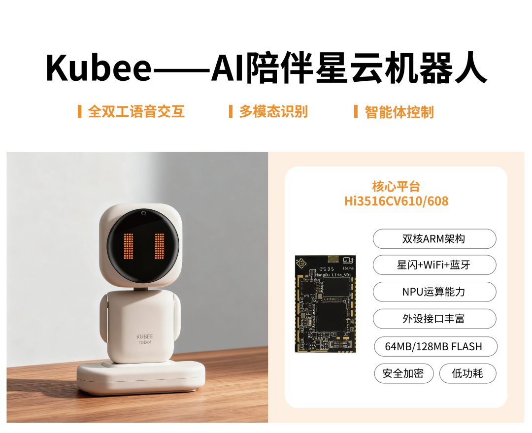 在核心技术架构上,Kubee Robot采用HongOU Lite模组 作为内核平台,该模组基于Hi3516CV610 主控SoC打造,是专为AIoT市场量身定制的低功耗模组方案。其轻量化设计与低功耗优势,完美适配桌面级智能设备的使用场景,可在保证性能稳定的同时,有效延长设备续航,为用户带来持久的智能交互体验。