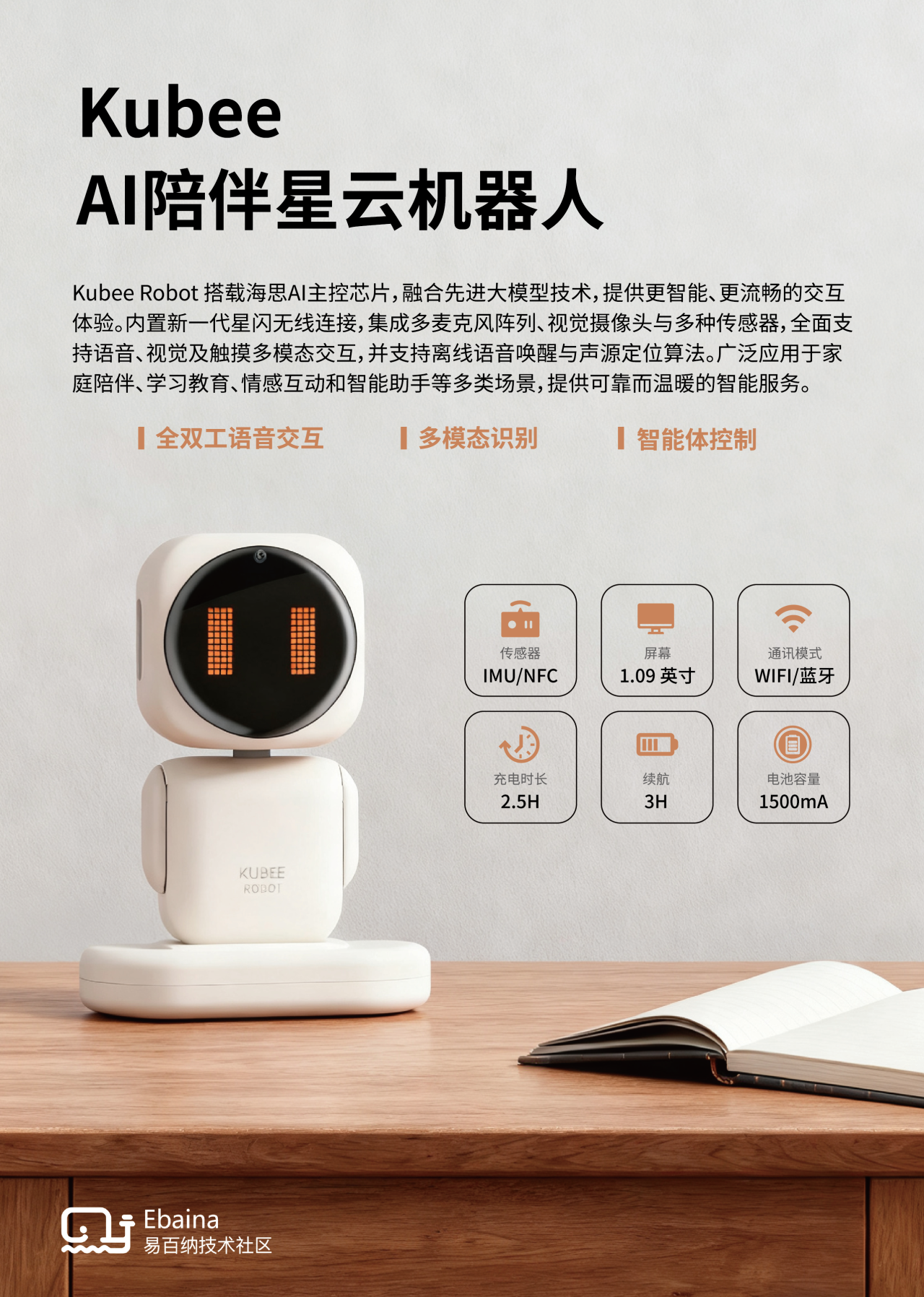 Kubee Robot AI桌面机器人是**南京启诺(易百纳运营公司)**研发的一款聚焦多模态智能交互的创新产品,其核心优势在于深度整合了硬件配置与软件算法的双重实力。硬件层面,机器人搭载海思AI主控,内置星闪无线连接技术,具备高速、稳定的传输能力;同时集成多麦克风阵列、视觉摄像头及多种高性能传感器,为多模态交互提供了坚实的硬件基础,可全面响应语音、视觉、触摸等多种交互指令,打破了传统单一交互模式的局限。