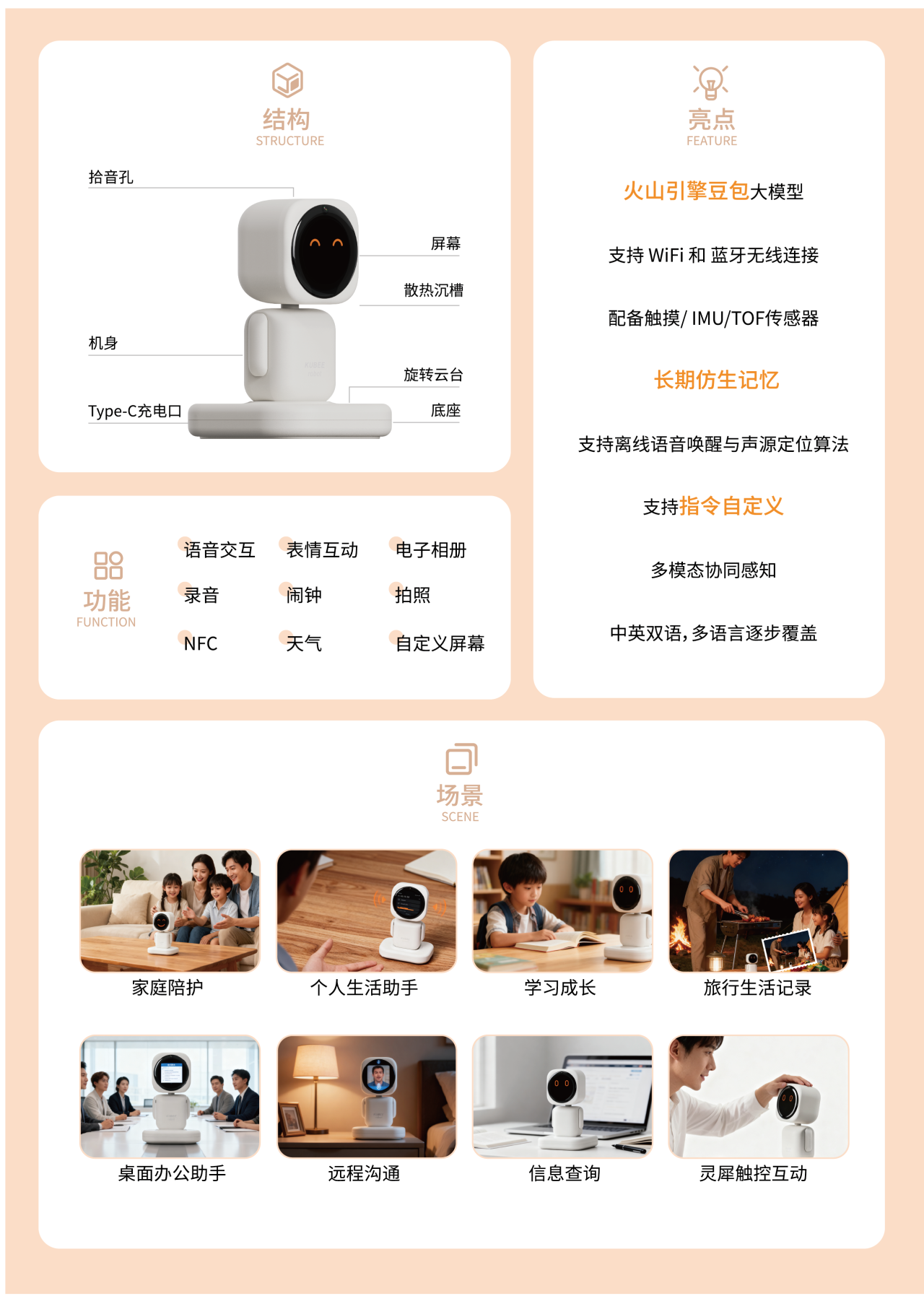 值得关注的是,该机器人深度融合了火山引擎豆包大模型能力,借助豆包大模型在语音理解、视觉识别、自然语言交互等领域的技术优势,打造出智能流畅的语音视觉交互体验。通过易百纳自主研发的多模态核心算法与火山大模型算法引擎的协同作用,Kubee Robot可实现唤醒词检测、语音命令识别、人脸检测与识别等多项核心功能,能够精准捕捉用户需求并快速响应,让人机交互更贴近自然交流的场景。