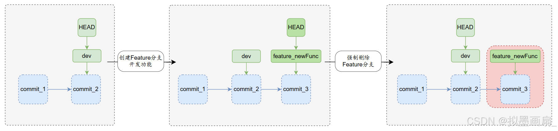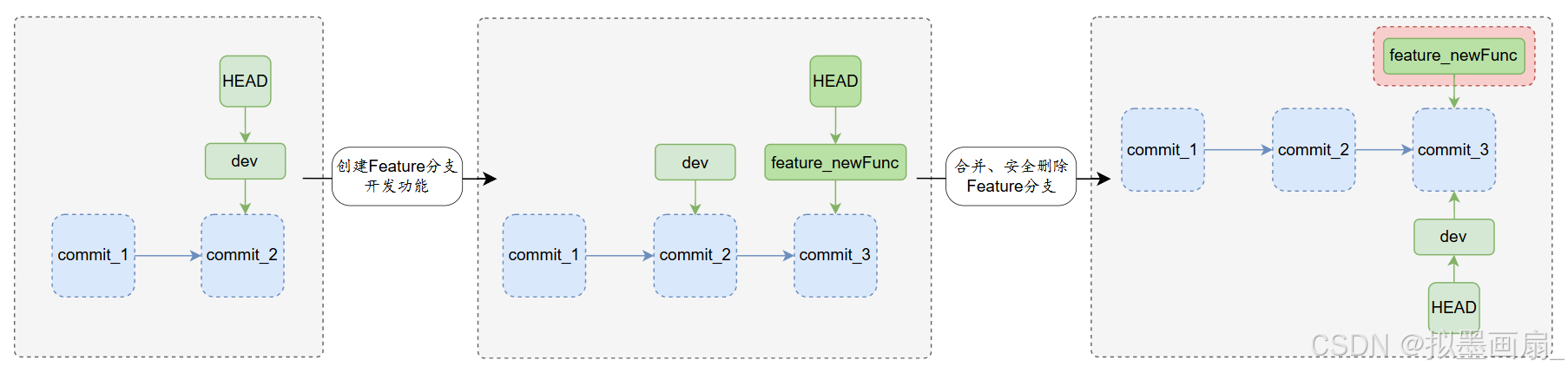 git branch -d------ 安全删除已合并分支(功能通过后)git branch -D------ 强制删除未合并分支(功能需废弃)