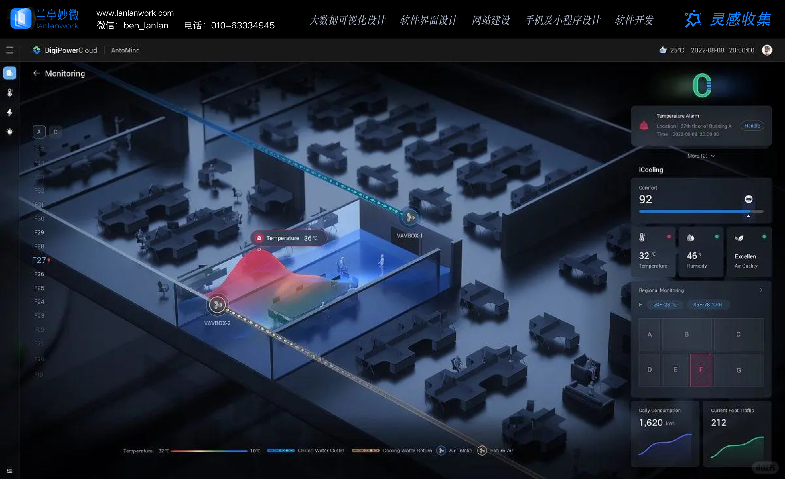 右侧面板整合 "温度预警、制冷系统状态、环境监测(温湿度、空气质量)" 等实时数据,支持区域切换、参数调节的交互操作;