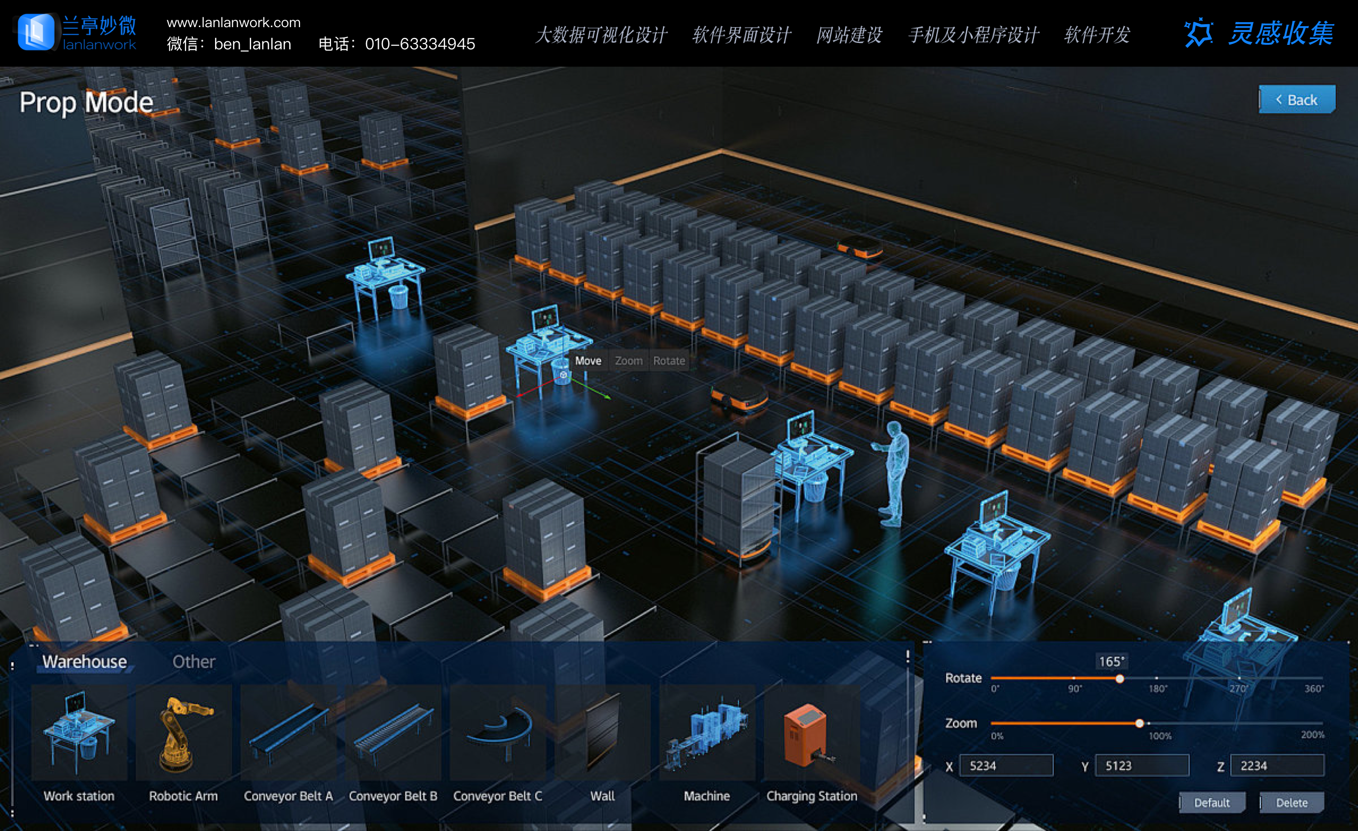 核心区域是仓储环境的 3D 建模场景,支持对工位、机械臂、传送带等设备进行 "移动、缩放、旋转" 的交互操作,适配仓储布局的规划需求;