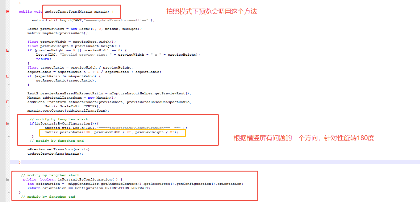第二步:拍照预览情况下判断横竖屏方向针对某一个方向进行预览旋转,实际情况就一个方向预览倒置。 方法 updateTransform(Matrix matrix) 修改如下: