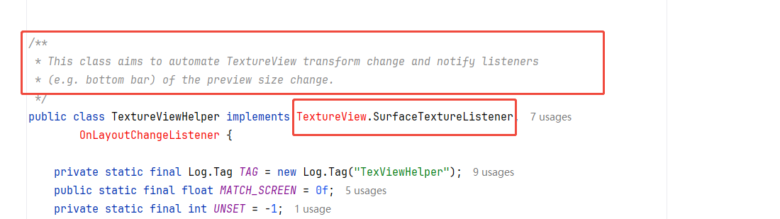 看类注释和这个类实现的类TextureView.SurfaceTextureListener 就大概率猜到这个类就是需要修改的类了,剩下的就是看日志 、分析流程的事情了。