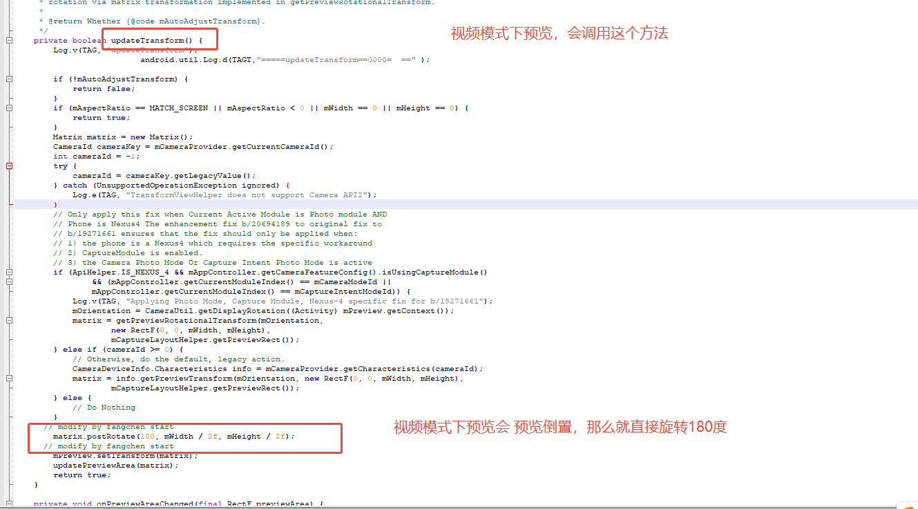 第三步:视频预览情况下进行预览旋转,实际情况是视频模式下预览都倒置,那么就直接旋转180度。 方法 updateTransform() 修改如下: