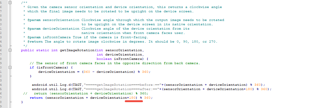 android.util.Log.d(TAGT,"=====getImageRotation====after:=="+(sensorOrientation + deviceOrientation+180) % 360);