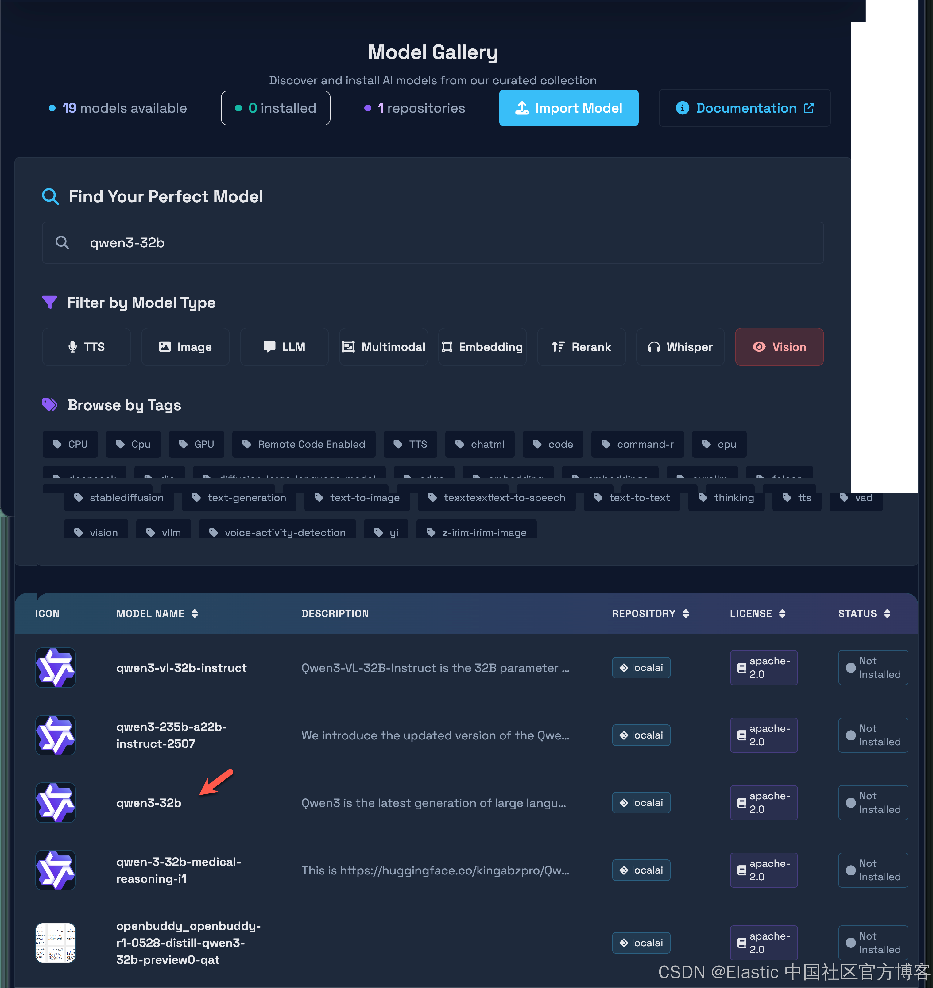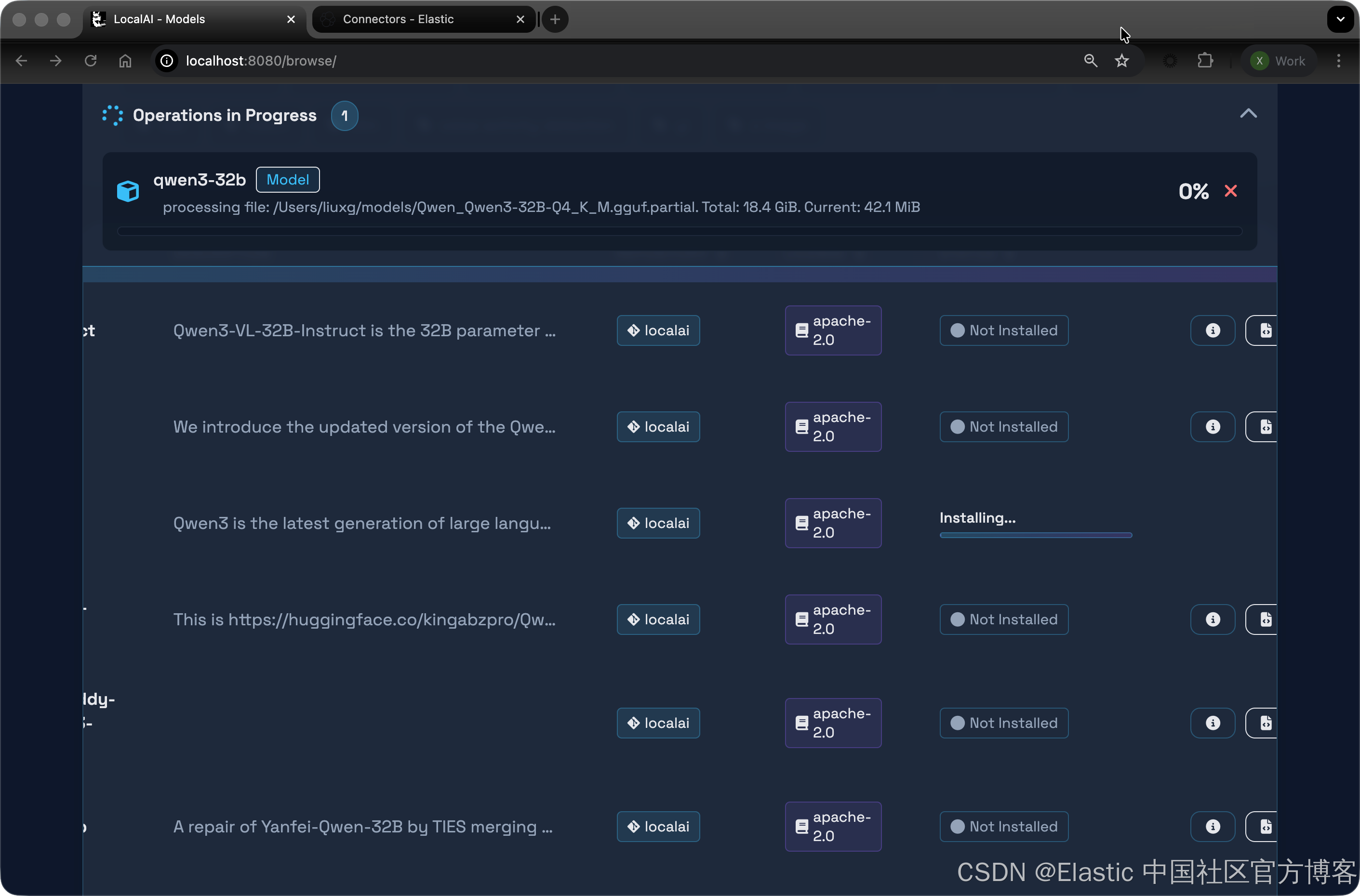 LocalAI 服务将在 8080 端口可访问,我们将在这里发送 HTTP 请求。让我们发送一个请求来下载 qwen3-32b 模型: