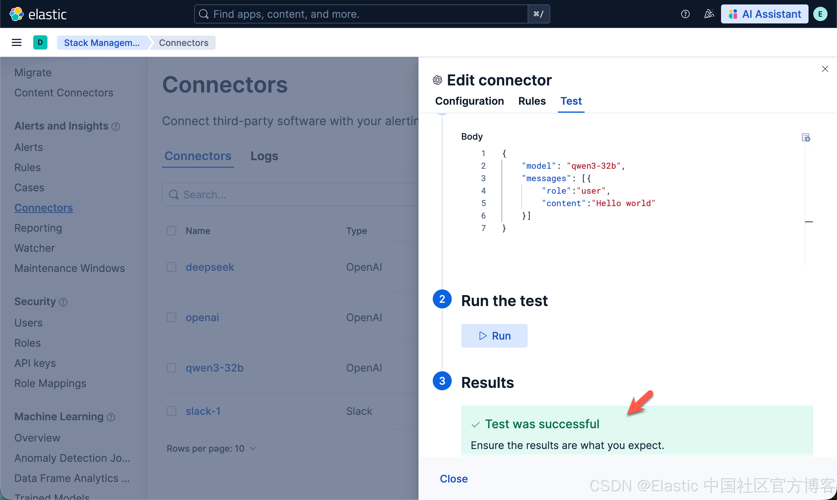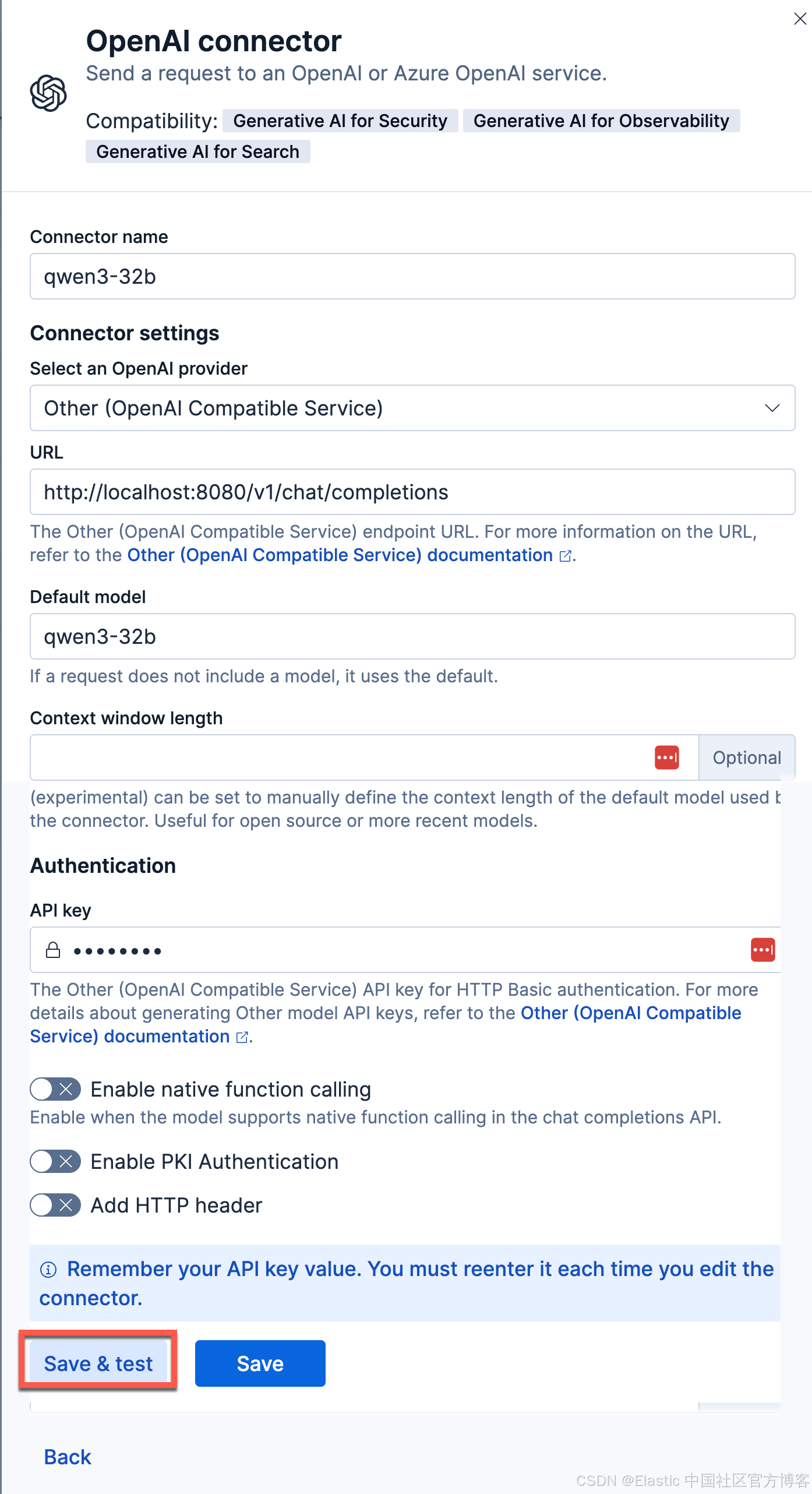 我们接下来配置一个 qwen3-32b 的连接器以连接到 Elasticsearch: