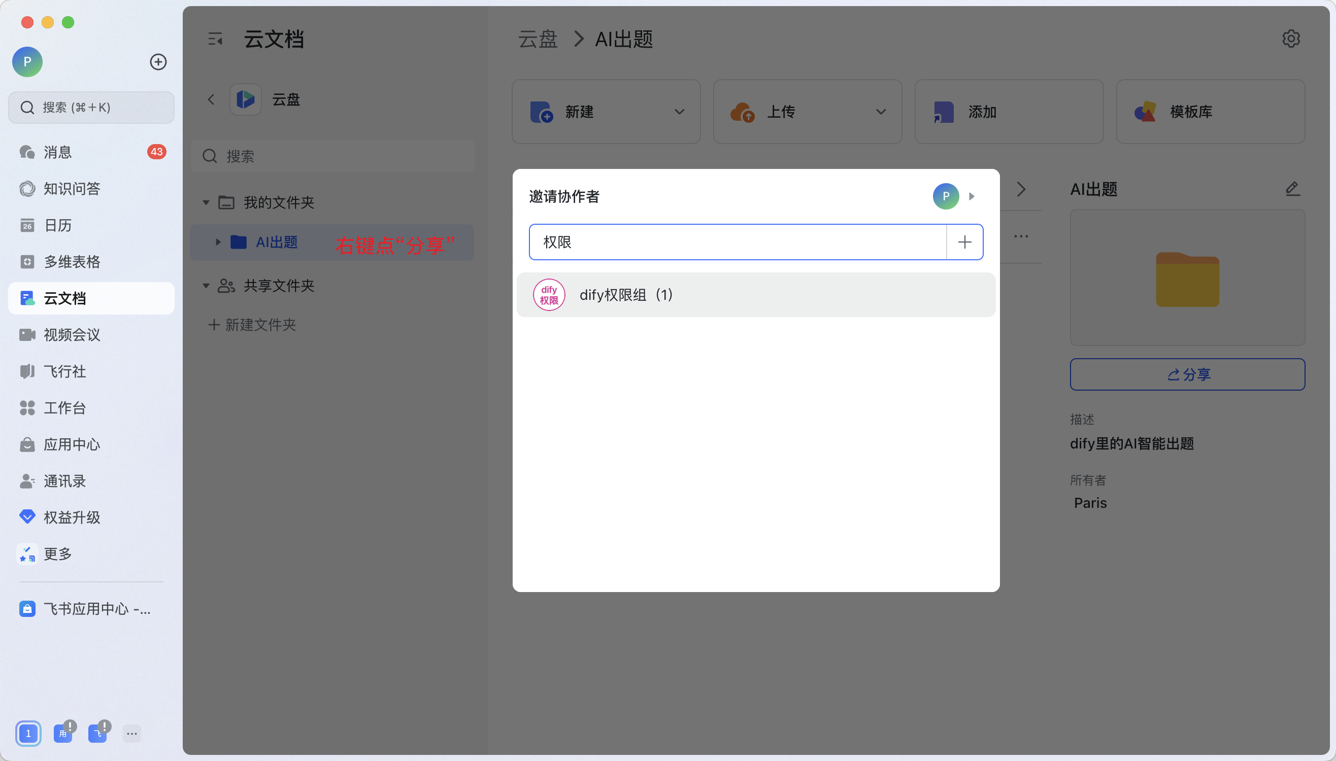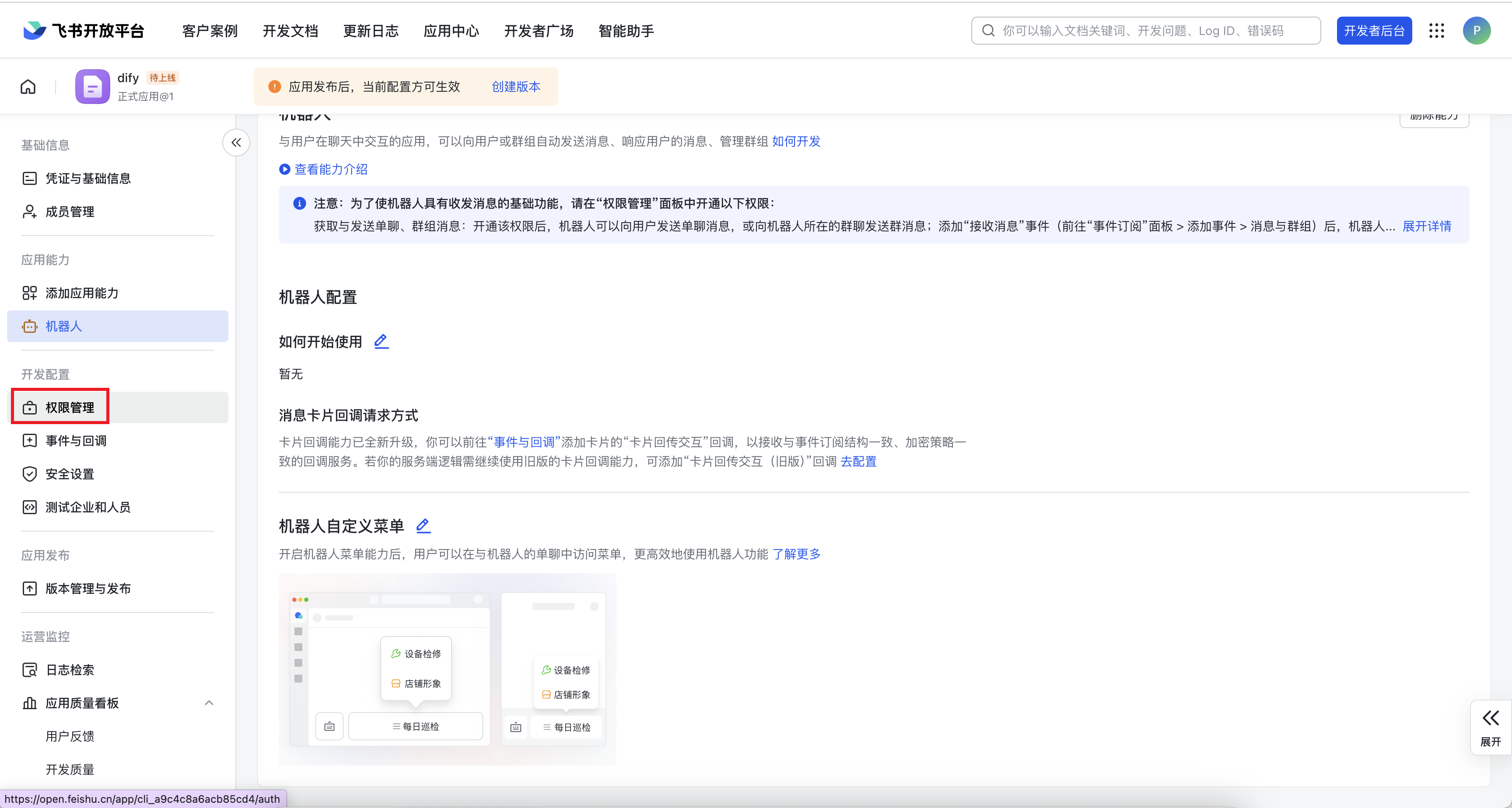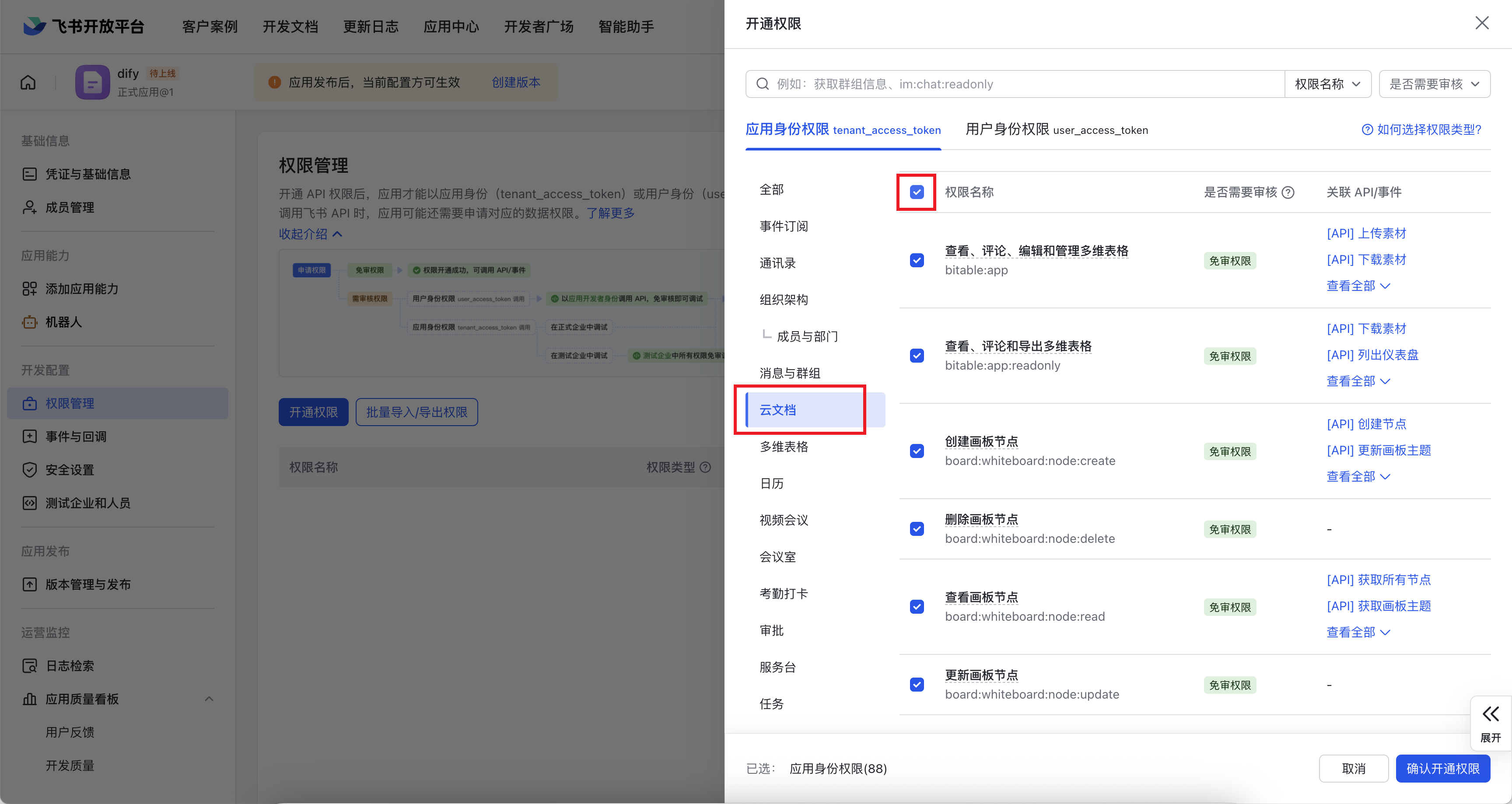 点左侧【权限管理】给机器人开通【云文档】的所有权限