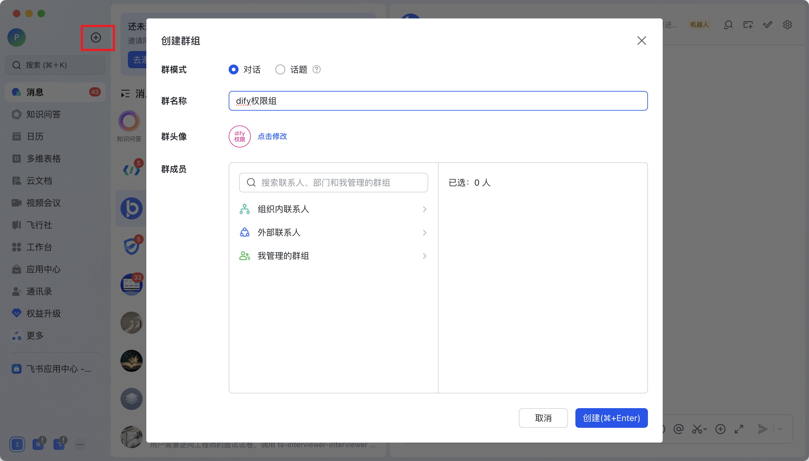 来到飞书首页,点击+创建群组,要给组内成员编辑文档的权限