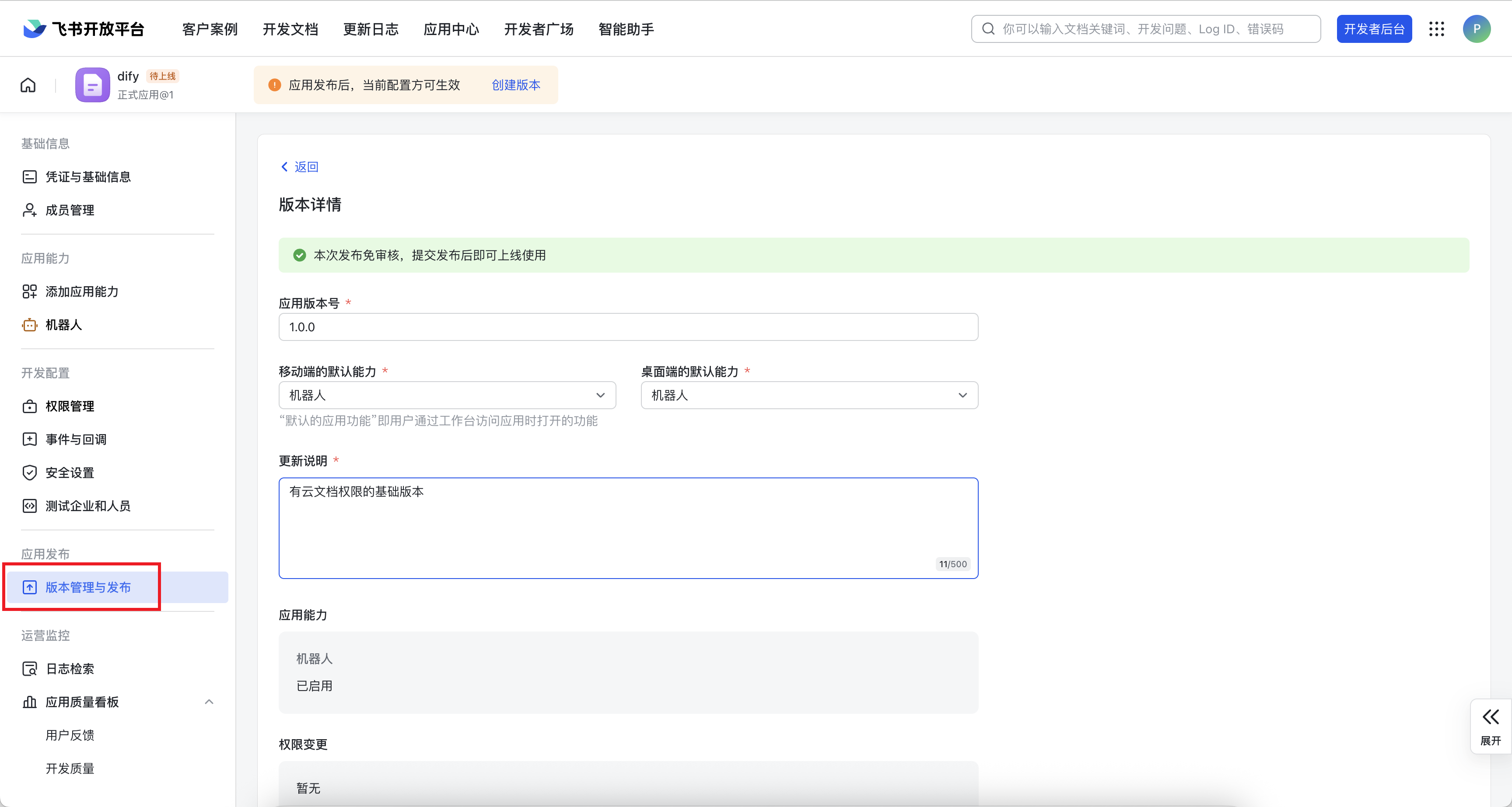 【版本管理与发布】填写版本号和说明,点击发布