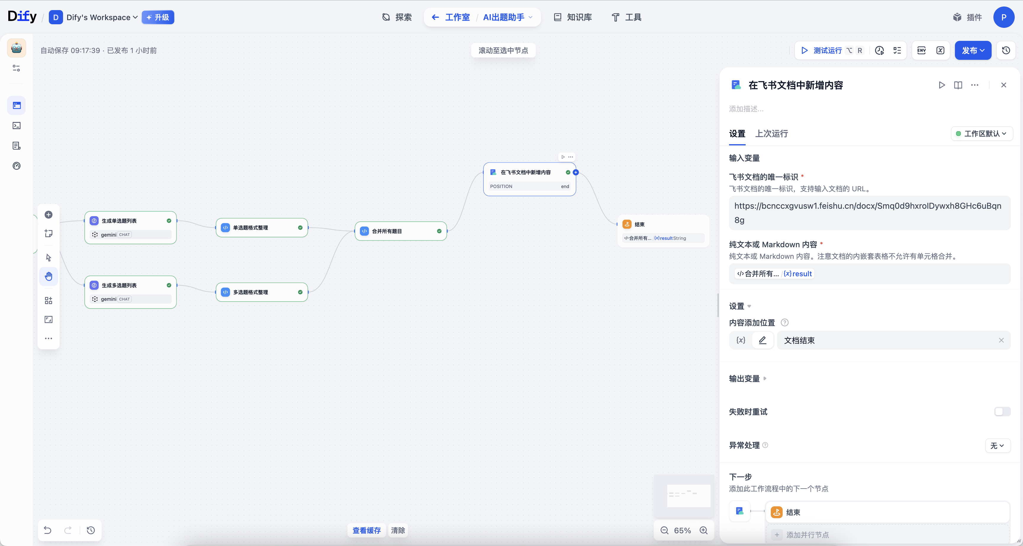 最后一步,自动将生成的完整试卷,通过飞书插件添加到预设飞书文档的末尾。