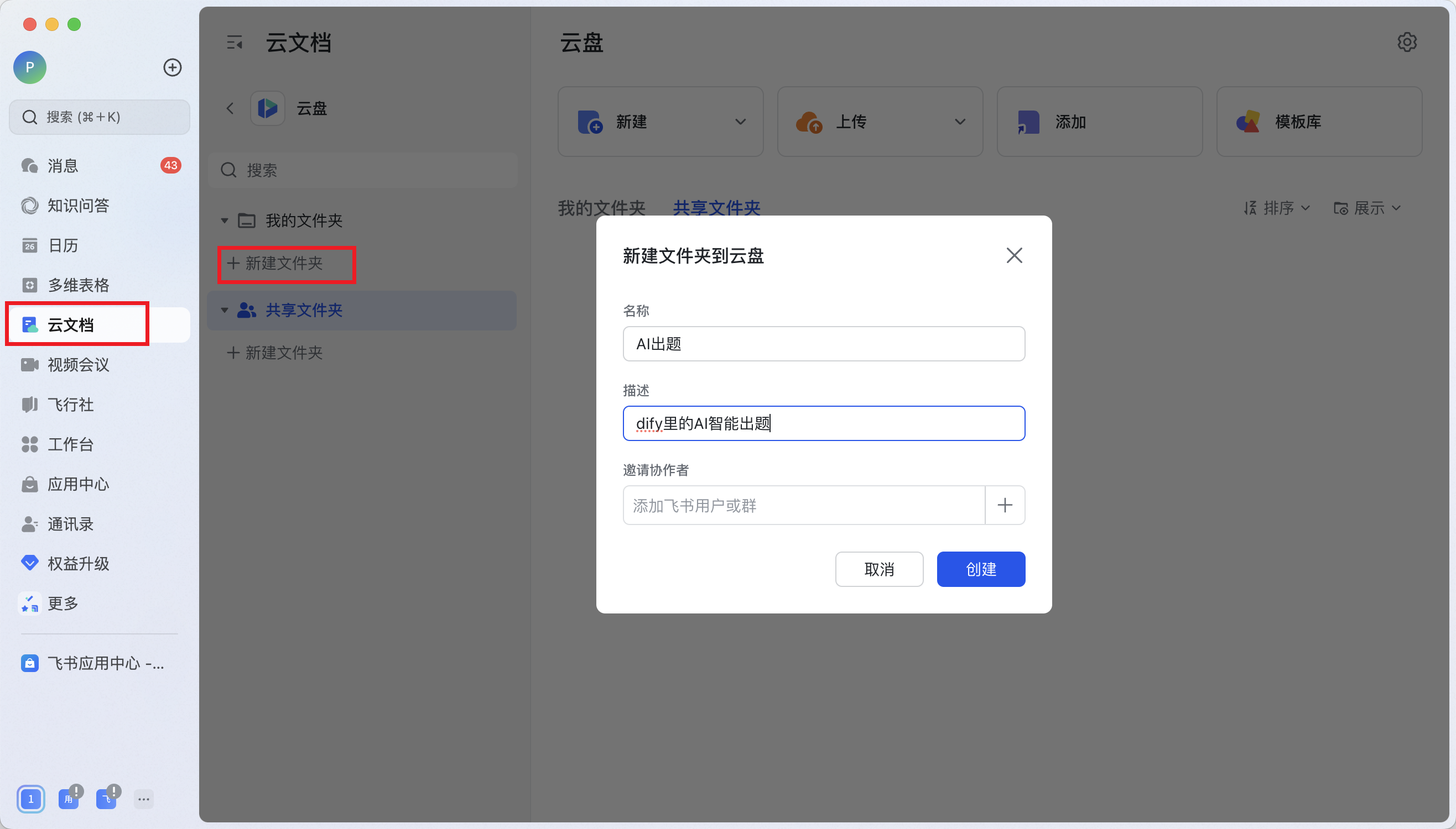 在【云文档】中新建文件夹