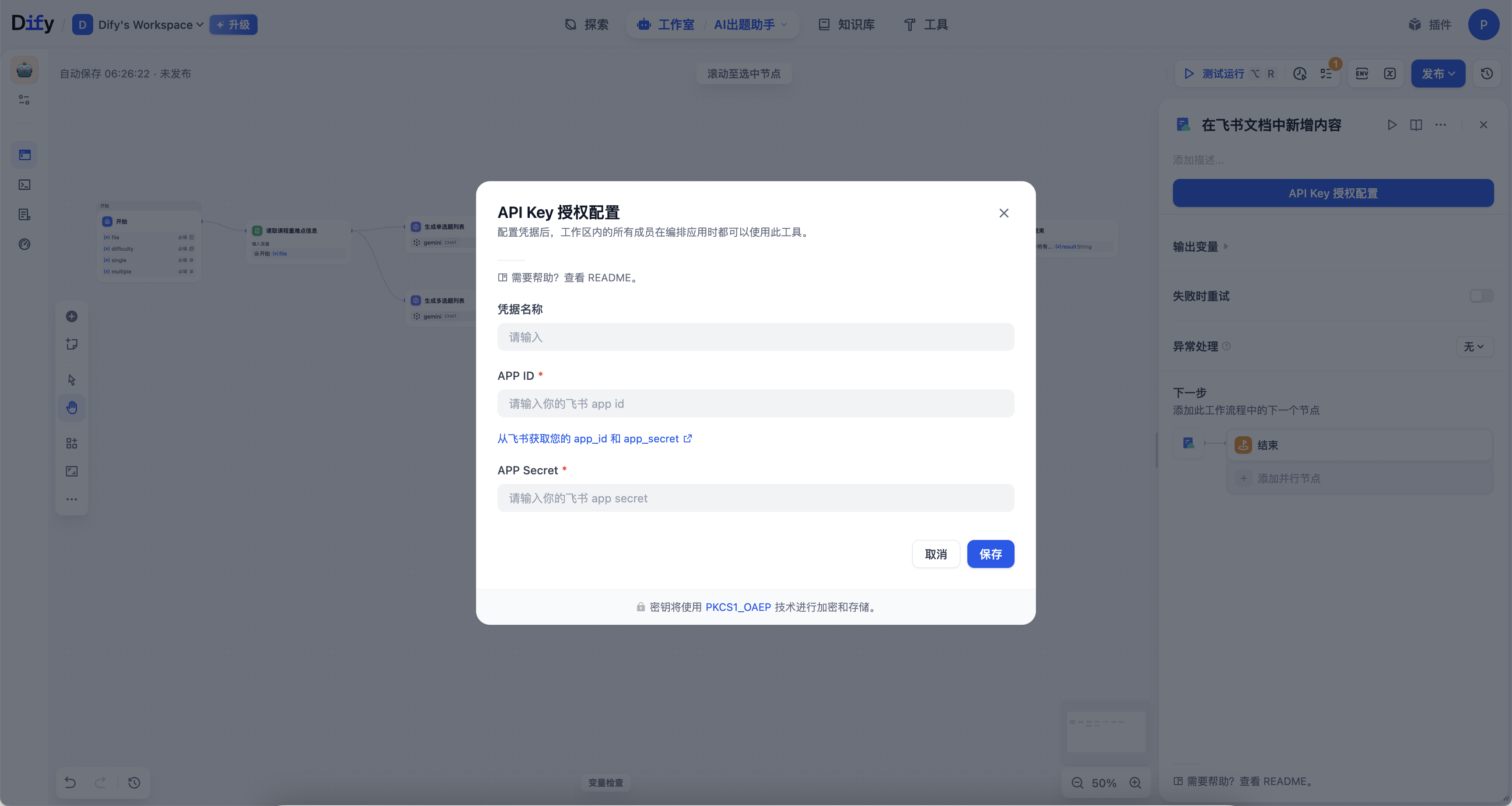 回到工作流粘贴APP ID 和 Secret ,在飞书文档标识填上url