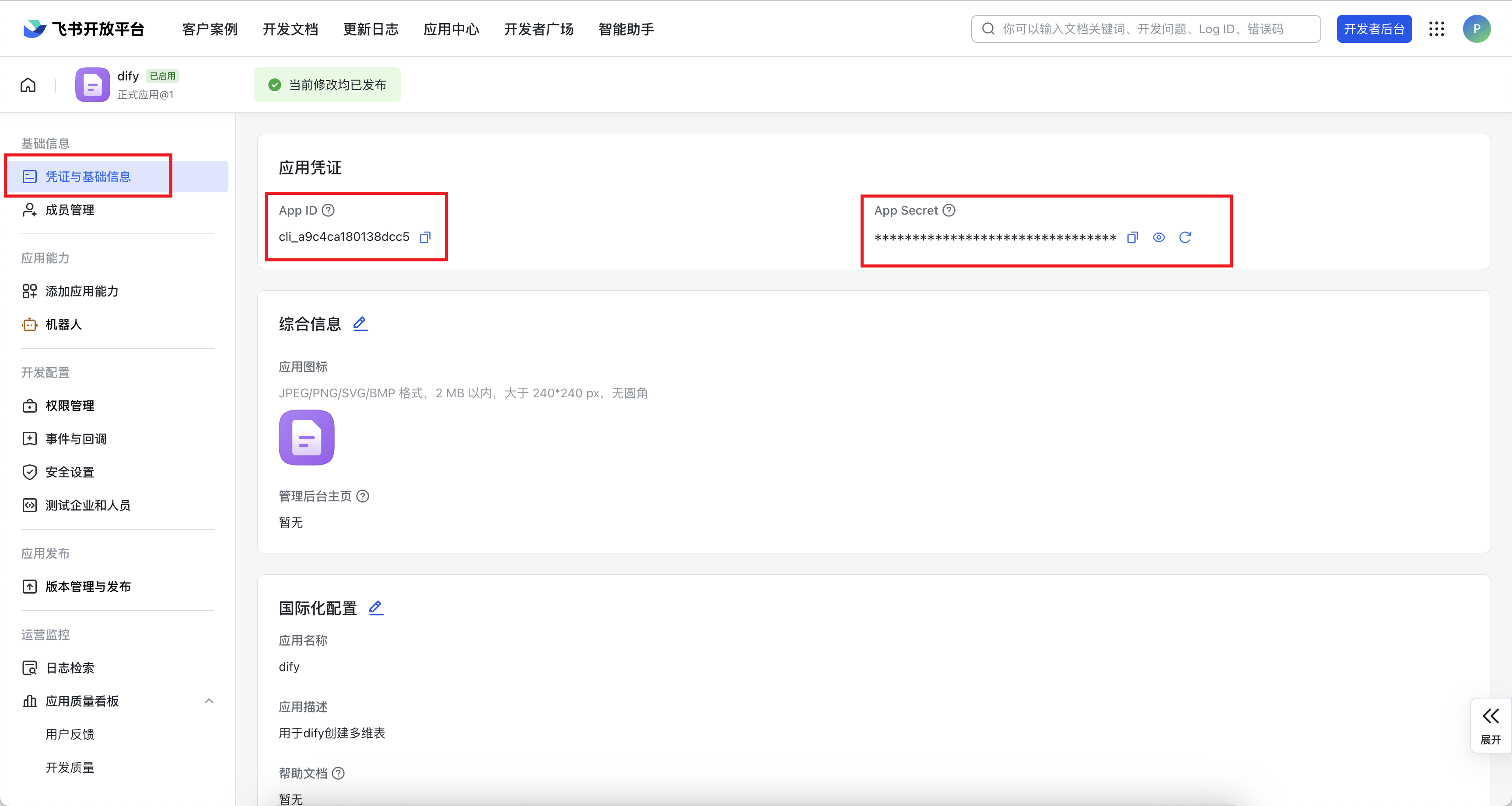 【凭证与基础信息】中获取 id 和 secret ,另存,工作流飞书插件的弹窗需要用到