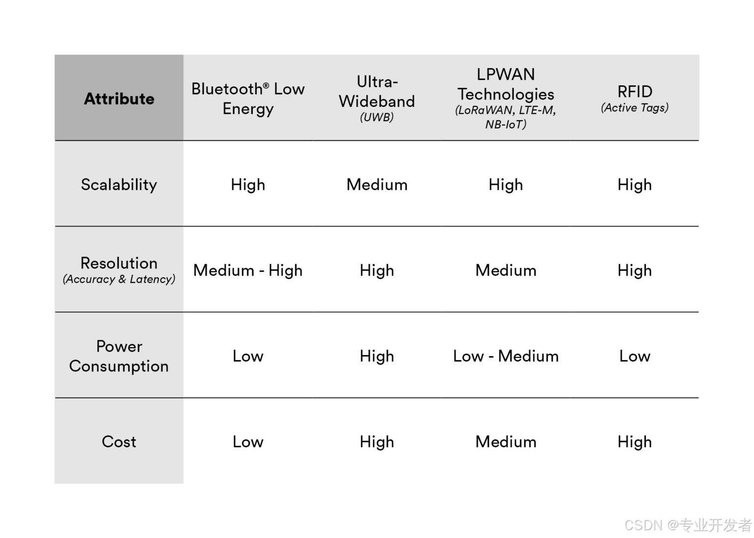 资产追踪应用选择无线技术时,需考虑以下核心属性: