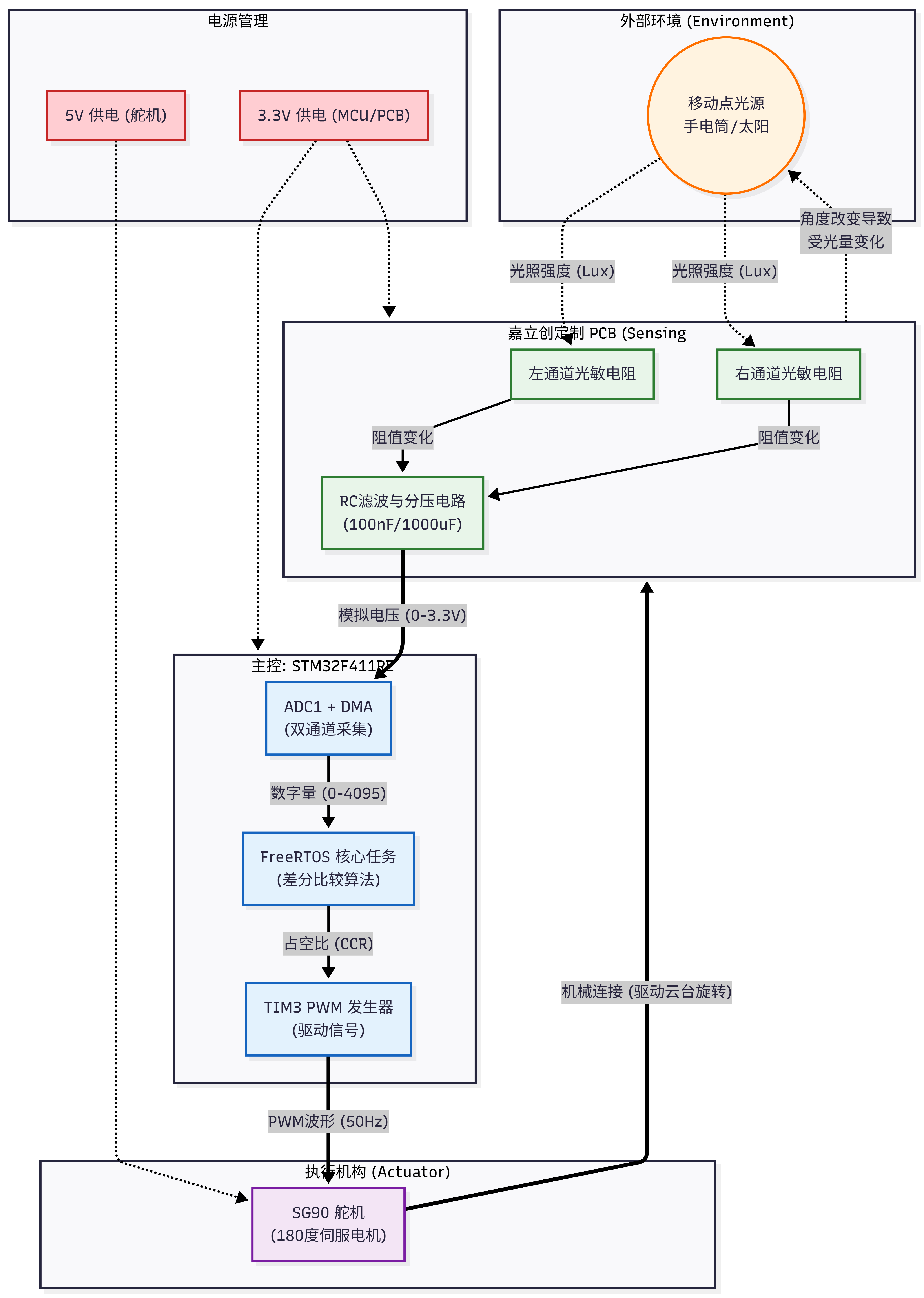 本系统基于 FreeRTOS 实时操作系统架构构建。在感知层,利用 STM32F411 的 ADC 多路分时复用技术,结合 TIM2 定时器触发(100kHz) 与 DMA 直接存储器访问,实现了对双路光敏传感器信号的高频、低延迟同步采集。 在控制层,核心任务实时计算两路电压的差分信号作为误差反馈,通过带死区的比例控制算法动态调制 TIM3 的 PWM 占空比,驱动舵机执行机构实时修正姿态,从而构建了一个高响应速度的闭环光源追踪系统,实现对点光源的自动捕获与跟随。
