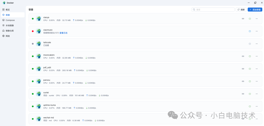 1、一键添加:安装了节点小宝的NAS或电脑之后,点击进入到【节点小宝控制台】,其客户端可以自动扫描并列出局域网内所有可识别的服务(包括各类Docker容器)。