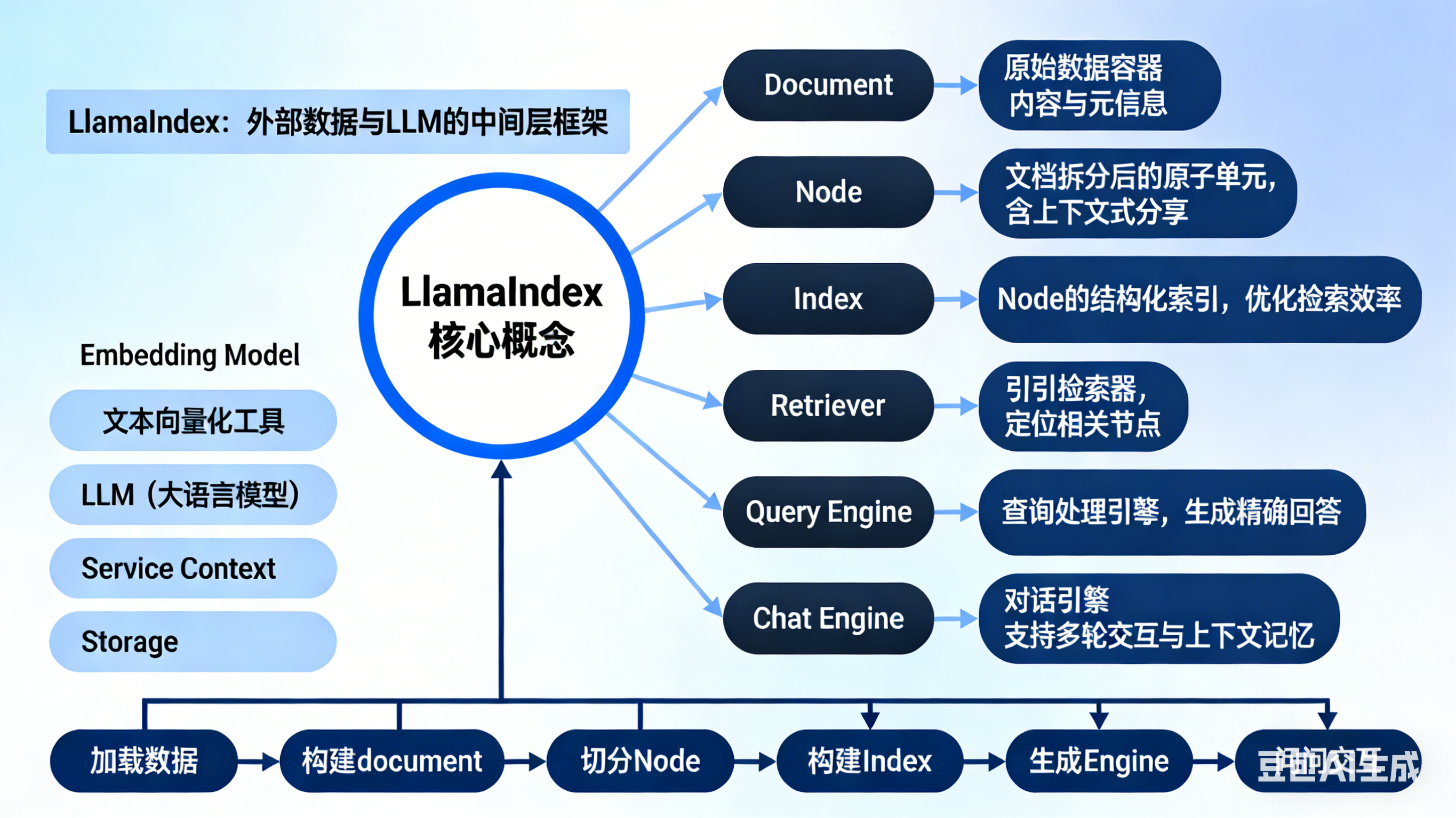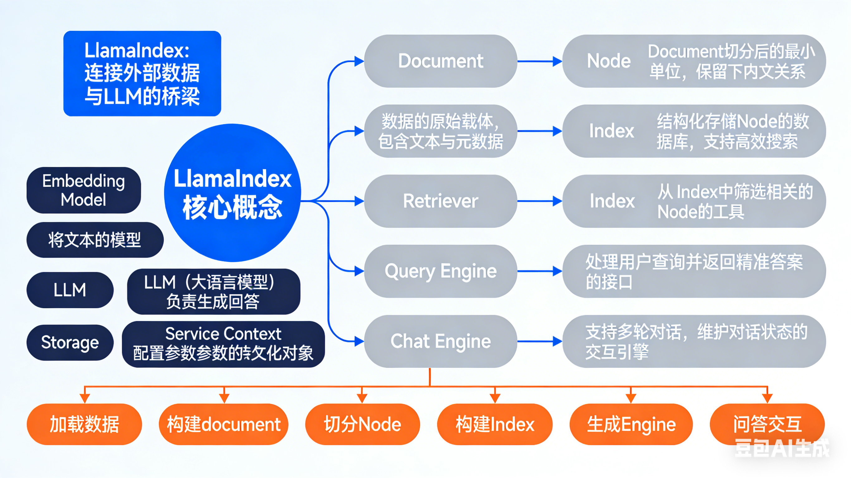 └─ 核心流程 :加载数据→构建Document→切分Node→构建Index→生成Engine→问答交互