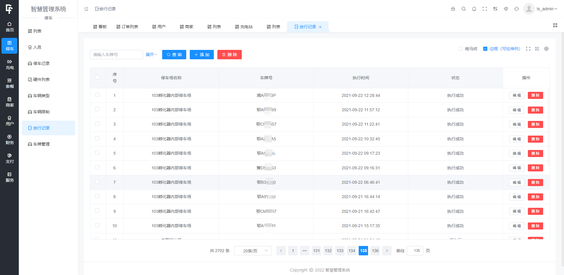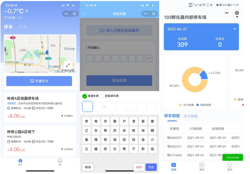 【功能介绍】:停车场系统,新能源充电桩系统,停车场小程序,智能停车,Parking system。①兼容市面上主流的多家相机,理论上兼容所有硬件,可灵活扩展,②相机识别后数据自动上传到云端并记录,校验相机唯一id和硬件序列号,防止非法数据录入,③用户手机查询停车记录详情可自主缴费(支持微信,支付宝,银行接口支付,支持每个停车场指定不同的商户进行收款),支付后出场在免费时间内会自动抬杆。④支持app上查询附近停车场(导航,可用车位数,停车场费用,优惠券,评分,评论等),可预约车位。⑤断电断网支持岗亭人员使用app可接管硬件进行停车记录的录入。