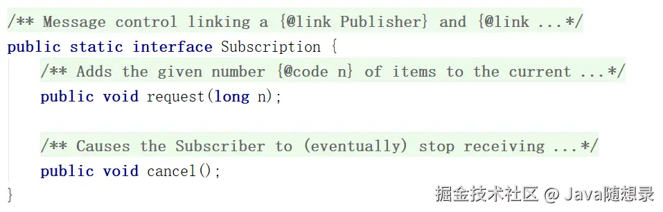 Subscription:发布者和订阅者是基于 Subscription 关联的。当建立了订阅的关系后,发布者会将 Subscription 传递给订阅者。订阅者指定获取元素的数量和取消订阅操作,都要基于 Subscription 去操作。提供了两个方法: