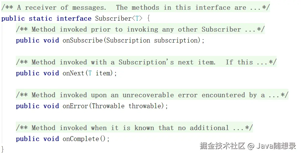 Subscriber:Subscriber 是订阅者,负责订阅,消费数据。四个方法:
