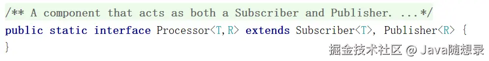 Processor:Processor 继承了 Publisher 和 Subscriber,即是发布者也是订阅者。Processor 一般作为数据的中转,订阅者处理完数据元素,可以再次发给下一个订阅者。