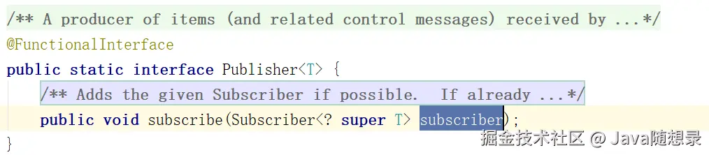 Publisher:Publisher 是函数式接口,负责发布数据的。 Publisher 内部有一个方法 subscribe 方法,去和具体的订阅者绑定关系。