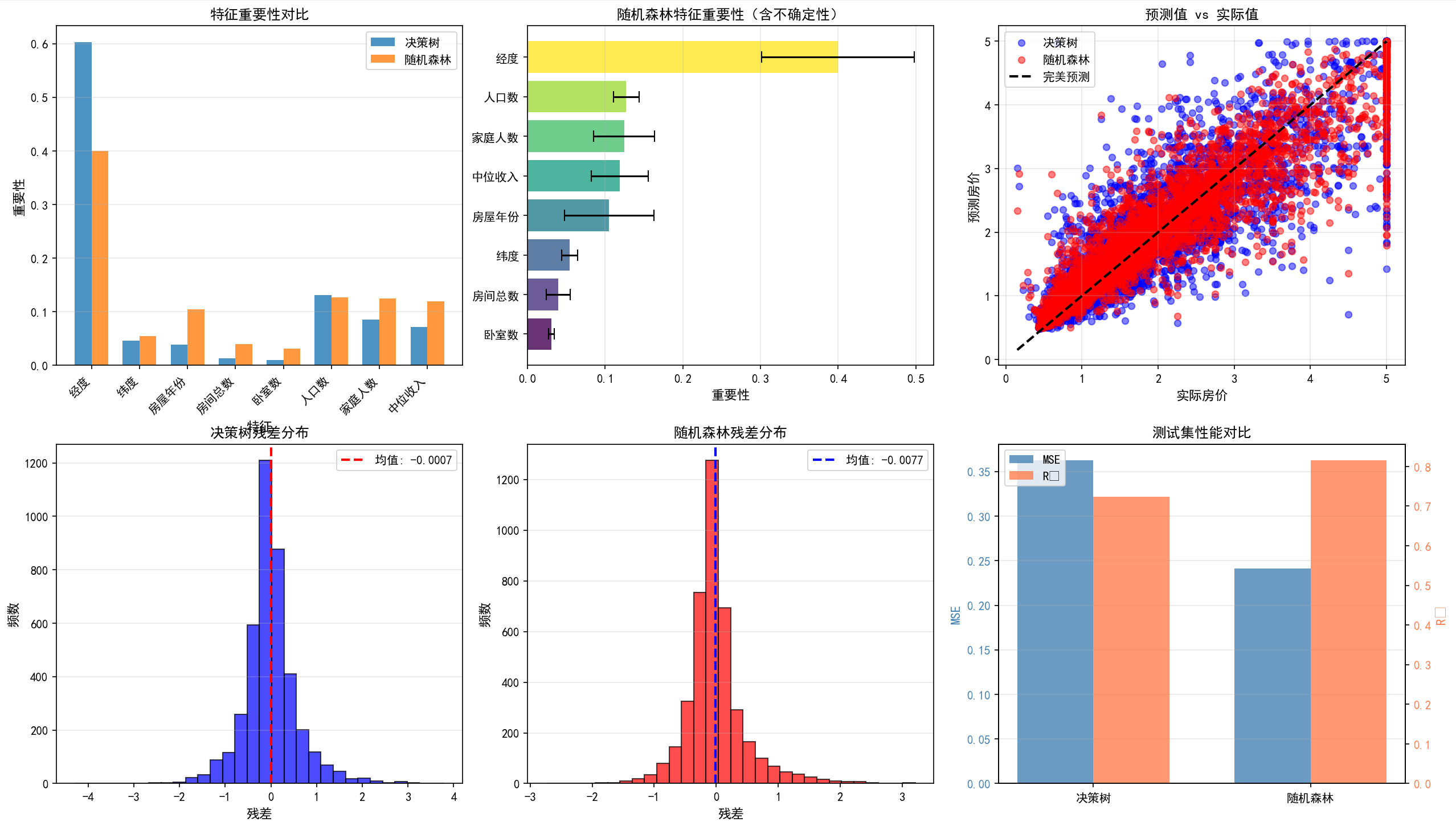 3. 特征重要性:中位收入(Median Income)是最重要的特征,这符合房价预测的实际
