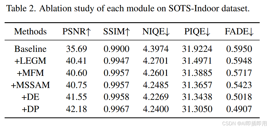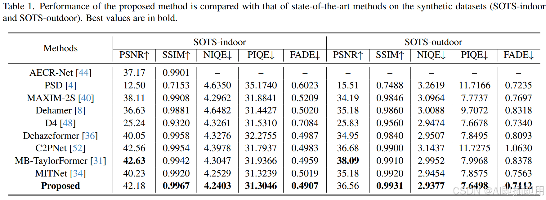 - 在 SOTS 测试集上,DICMP 取得了 SOTA 的 PSNR/SSIM 指标。