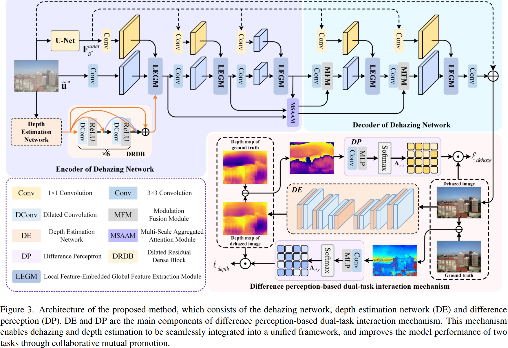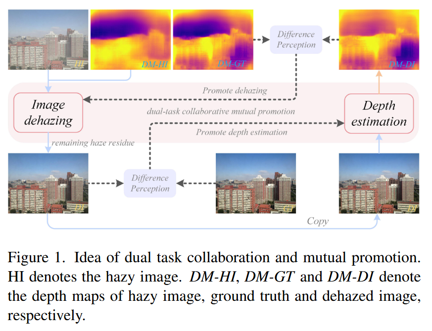 本文提出了一种名为 DICMP (Depth Information Assisted Collaborative Mutual Promotion) 的双任务框架,旨在解决单幅图像去雾中结构信息丢失和深度感知不足的问题。其核心思想是构建一个去雾与深度估计的闭环系统 :一方面,利用双任务交互模块(DTI)将深度特征注入去雾网络以辅助物理模型建模;另一方面,提出差异感知机制(Difference Perception),利用"去雾后图像的预测深度"与"真实深度"之间的差异,反向监督去雾网络,迫使其重点关注那些深度估计不准(通常也是雾最浓、最难恢复)的区域。