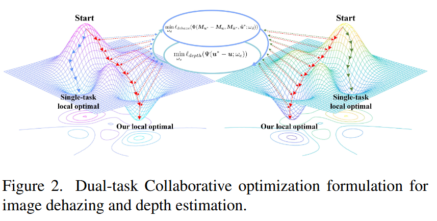 让两个网络不再是孤岛。在浅层,深度网络分享边缘信息给去雾;在深层,深度网络分享全局距离信息给去雾,帮助去雾网络区分"白色的墙"和"白色的雾"。