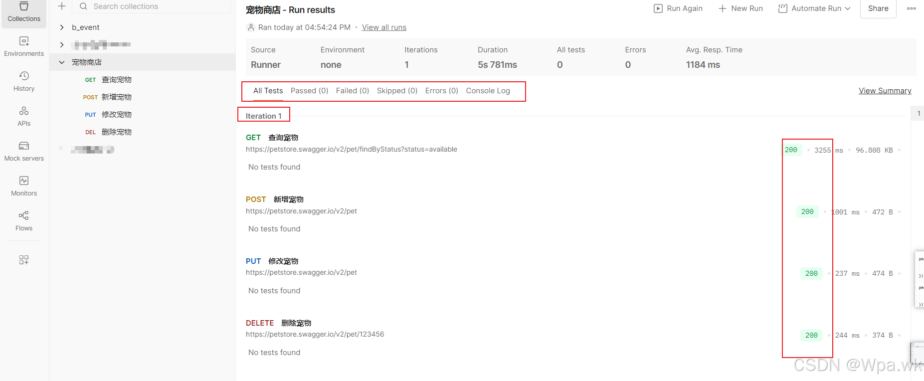 运行后可查看结果:点击任意一个接口,可以查看响应,请求头信息和请求信息