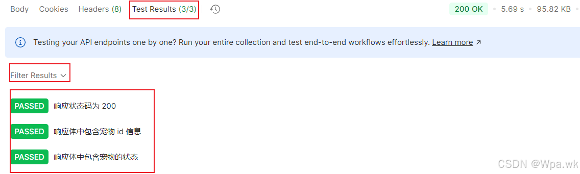 运行测试集后,可以点击结果查看详细信息,点击接口查看请求头,参数,body等信息