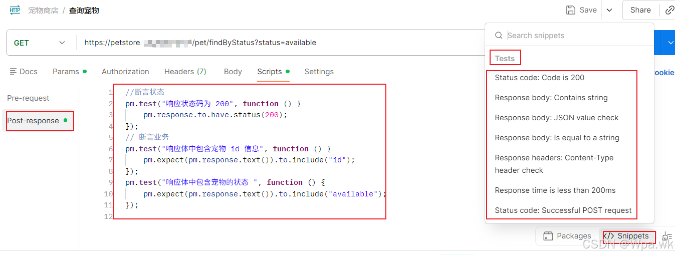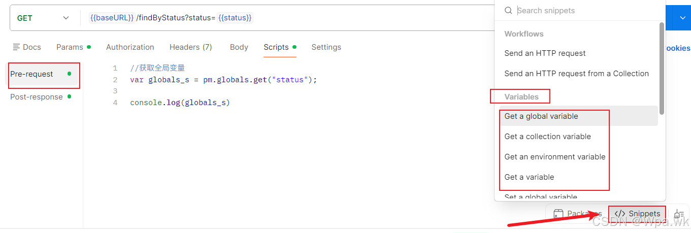 寻找:Scripts中的Pre-request/Post-response中的右下方</>Snippets点击即可