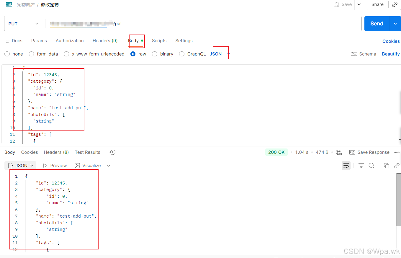 修改接口:PUT请求,url, 对应的修改请求的参数,在JSON中,预期获取的响应与修改的JSON一样即可;