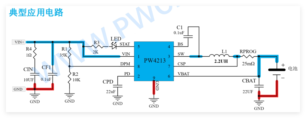功率路径布局应遵循"短而宽"的原则:从输入电容正极到芯片VIN引脚,再到BAT引脚和输出电容,最后至电池连接器的路径应最小化。PW4056HH的热管理需要系统性规划------散热焊盘必须与PCB铜层完全焊接;建议使用2盎司铜厚;散热过孔直径0.3-0.4mm,间距1.0-1.5mm;避免在热源上方放置温度敏感器件。