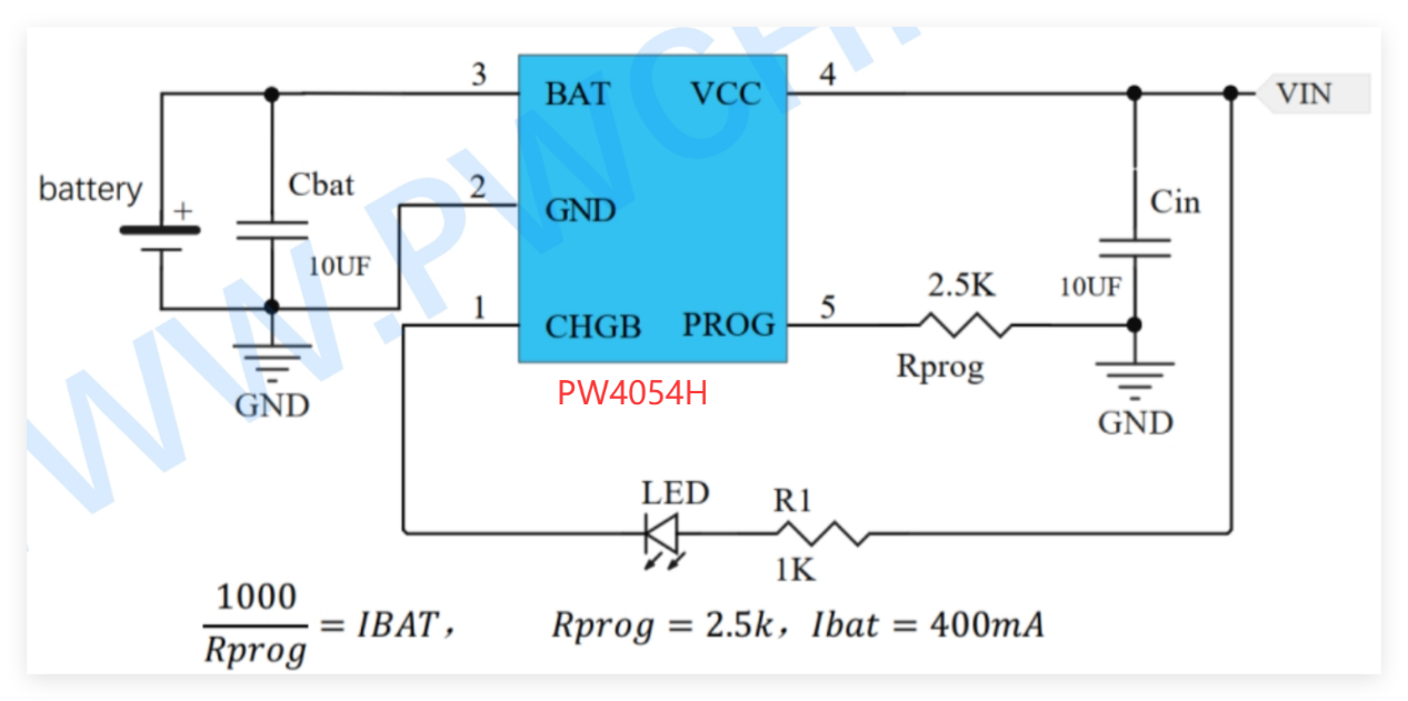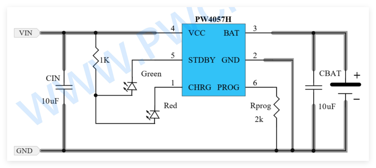 在保持500mA充电能力的基础上,PW4057H升级为双LED状态指示系统。这种设计提供了更直观的用户体验:一个LED指示充电过程,另一个指示充满状态。这种明确的视觉反馈在医疗设备、消费电子等需要清晰状态指示的场景中尤为重要。其封装兼容性和外围元件数量与PW4054H保持一致,为工程师提供了无需重新布局的直接升级路径。
