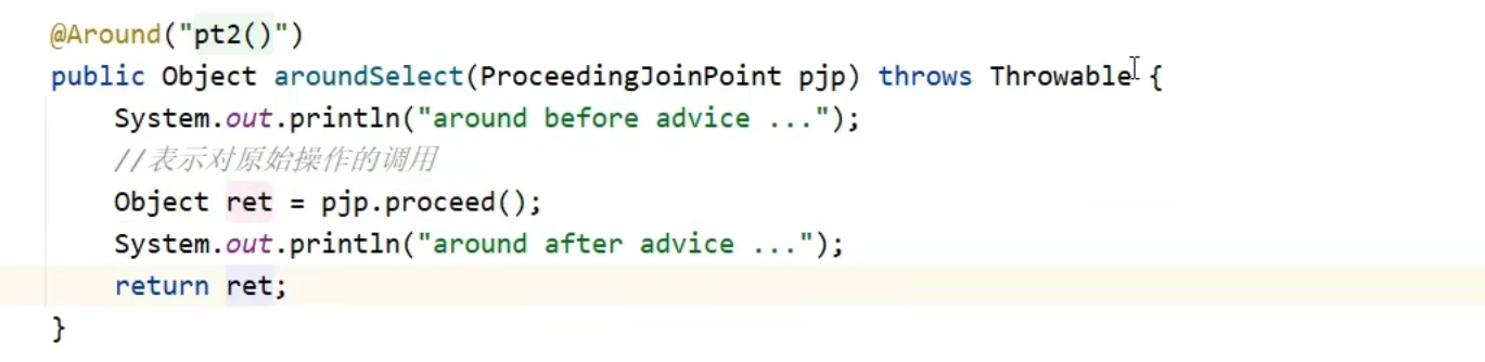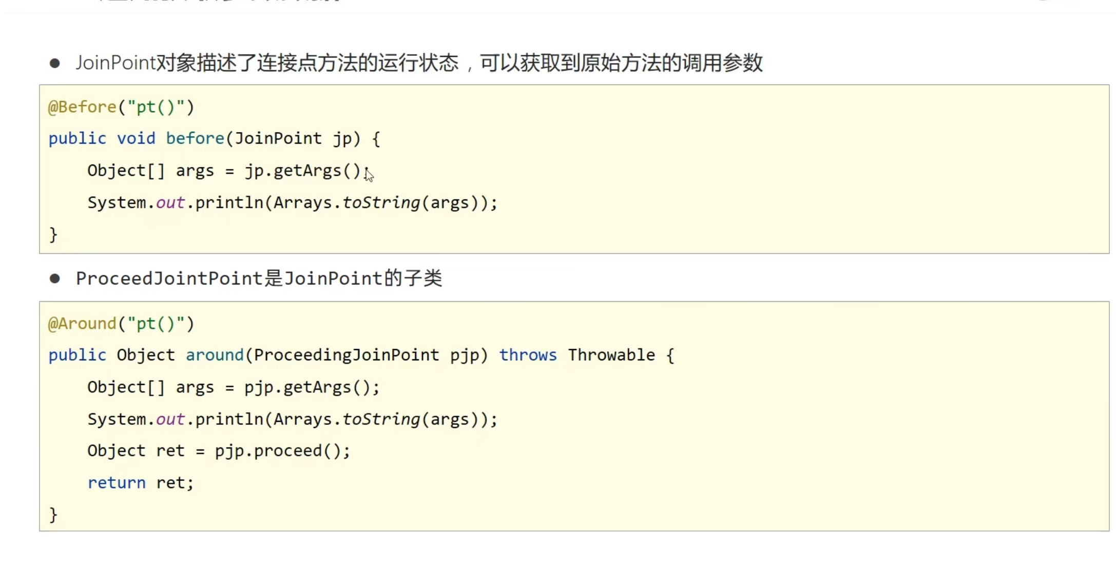 然后因为是环绕,我们需要对原来的操作进行调用,传入形参ProceedingJoinPoint pjp,用这个来调用,我需要告诉他们在原始操作之前进行调用,还是之后进行调用